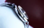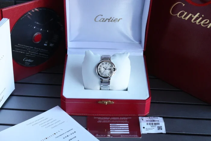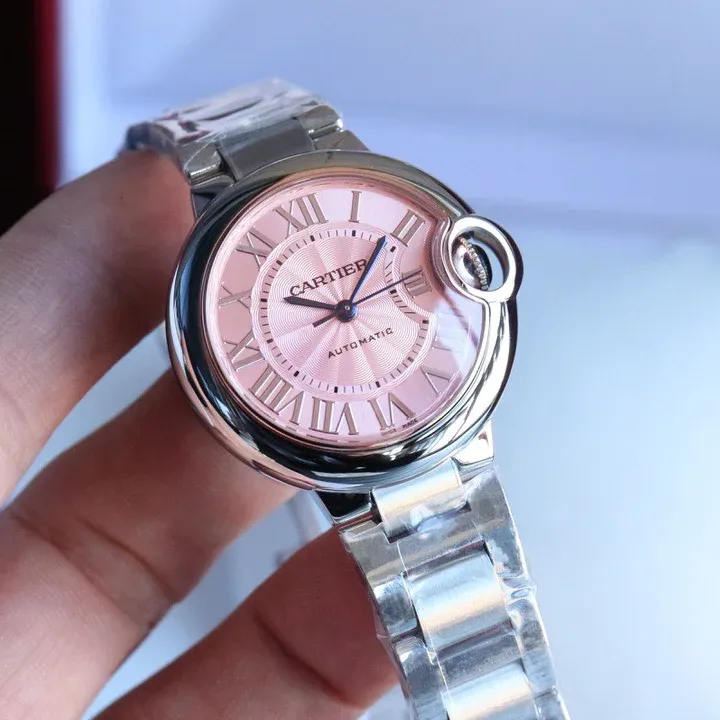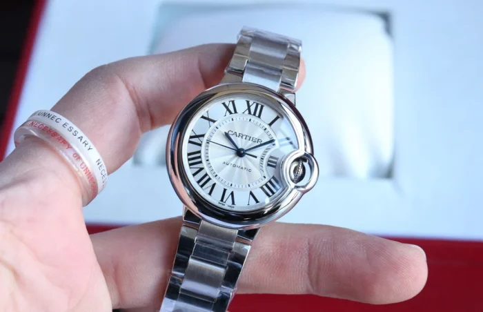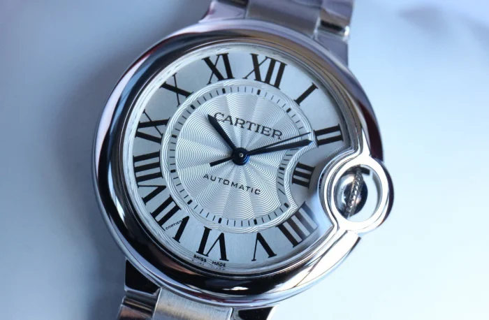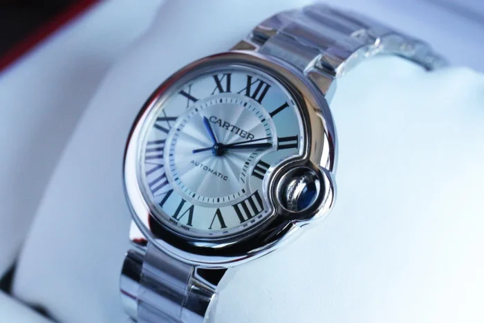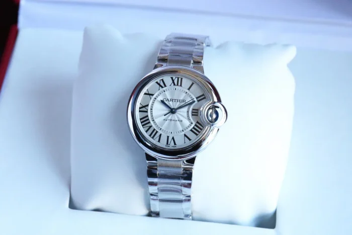 Ballon Bleu de Cartier watch, 28 mm, quartz movement. Steel case, fluted crown set with a synthetic spinel cabochon, silvered opaline dial, Roman numerals, sword-shaped hands in blued steel, sapphire crystal, steel bracelet. Case dimensions: diameter: 28.6 mm, thickness: 9.35 mm. Water-resistant to 30 metres/100 feet.