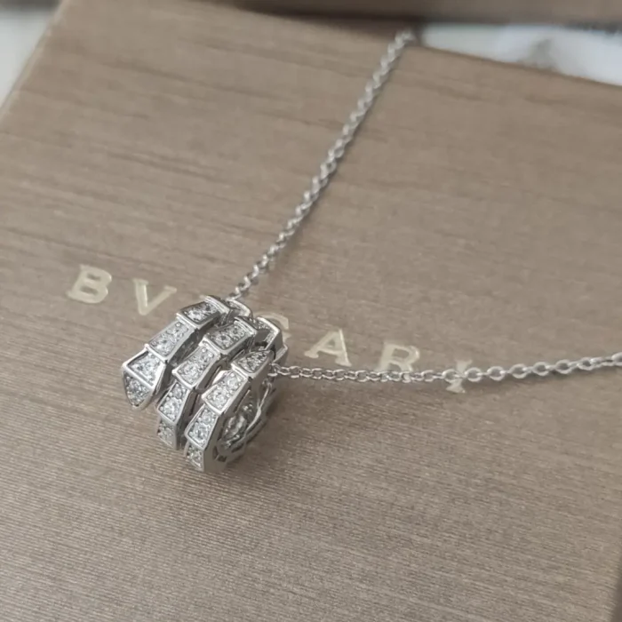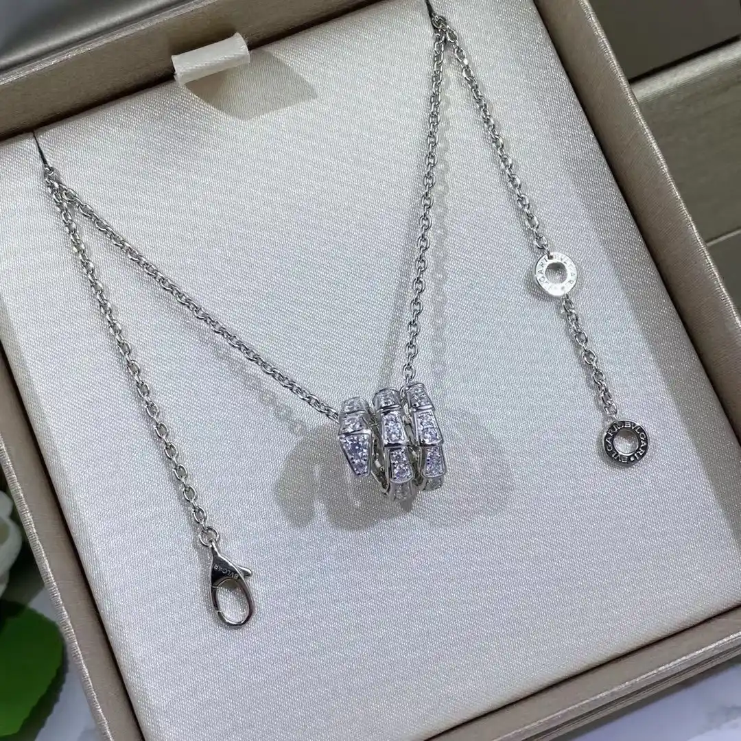 The BVLGARI Serpenti Viper necklace is an iconic statement of high jewelry artistry. It reinterprets the ancient serpent motif, a cornerstone of the BVLGARI identity, through a contemporary lens. The pendant features the distinctive, geometric scales of the Viper collection, rendered in luminous 18K white gold and set with a breathtaking expanse of pavé diamonds, resulting in a piece that is both architecturally striking and intensely radiant.